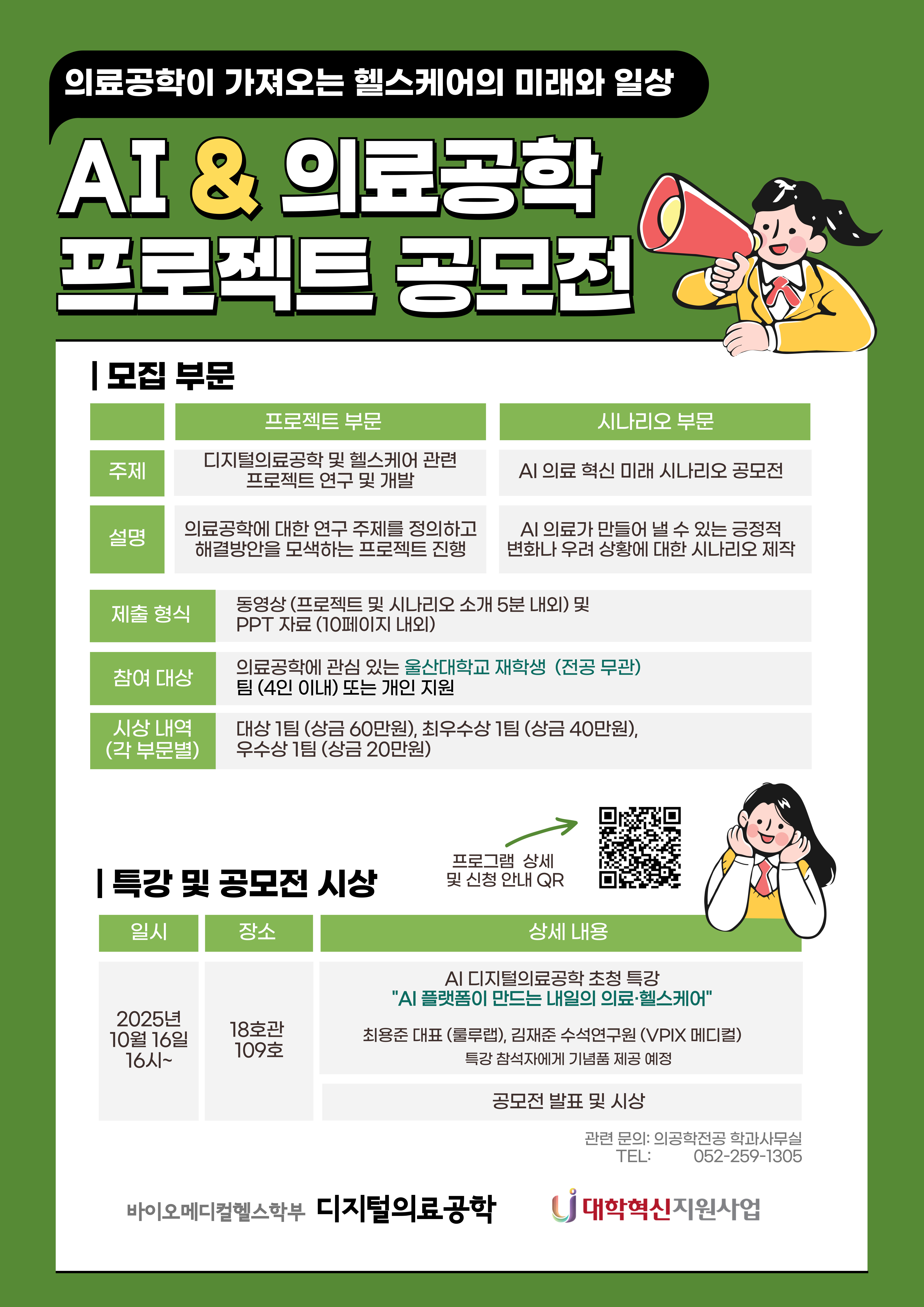 대학혁신지원사업의 일환으로 의공학전공에서 진행하는 공모전을 안내드립니다. 지원 자격 울산대학교 재학생 (전공 무관) | 팀(4인 이내) 또는 개인 지원 제출기한: 2025년 10월 12일 18시까지 시상 내역 각 분야 별 대상 1팀 상금 60만원, 최우수상 1팀 상금 40만원, 우수상 1팀 상금 20만원 접수 방법 : 포스터 상의 QR코드 혹은 아래의 링크를 통해 신청 https://ustar.ulsan.ac.kr/ko/program/ALL/view/2774 |